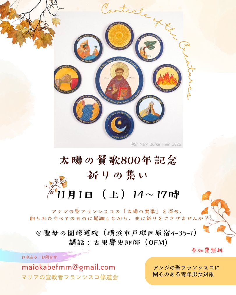 【11月1日】太陽の賛歌800年 祈りの集い fmm staff (admin)2025年10月10日2025年10月10日 祈りの集い・黙想会のお知らせ ← FMM日本管区の歩み-85 【11月7日 19時~21時】祈りの集い in 東京 →