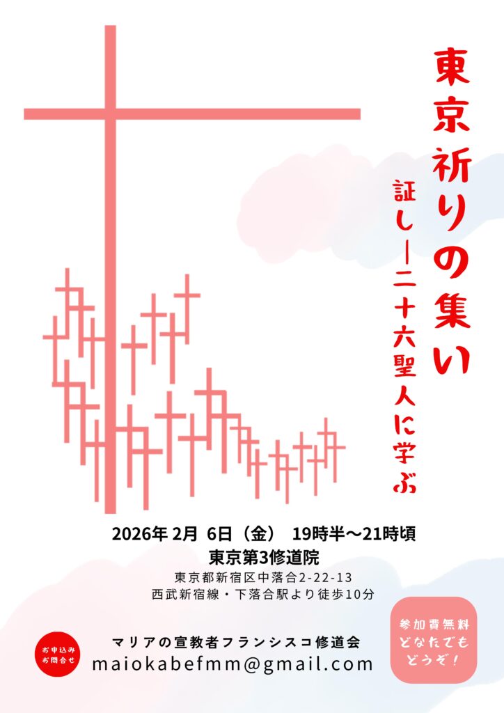 【2月 東京】祈りの集い fmm staff (admin)2026年1月15日 祈りの集い・黙想会のお知らせ 2月の祈りの集い(東京)のご案内です。ご参加をお待ちしています! ← FMM日本管区の歩み-92 FMM日本管区の歩み-93 →